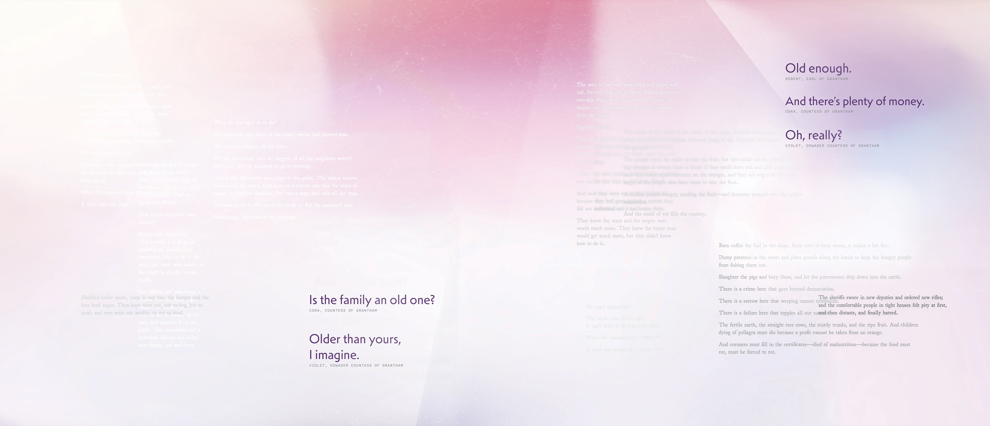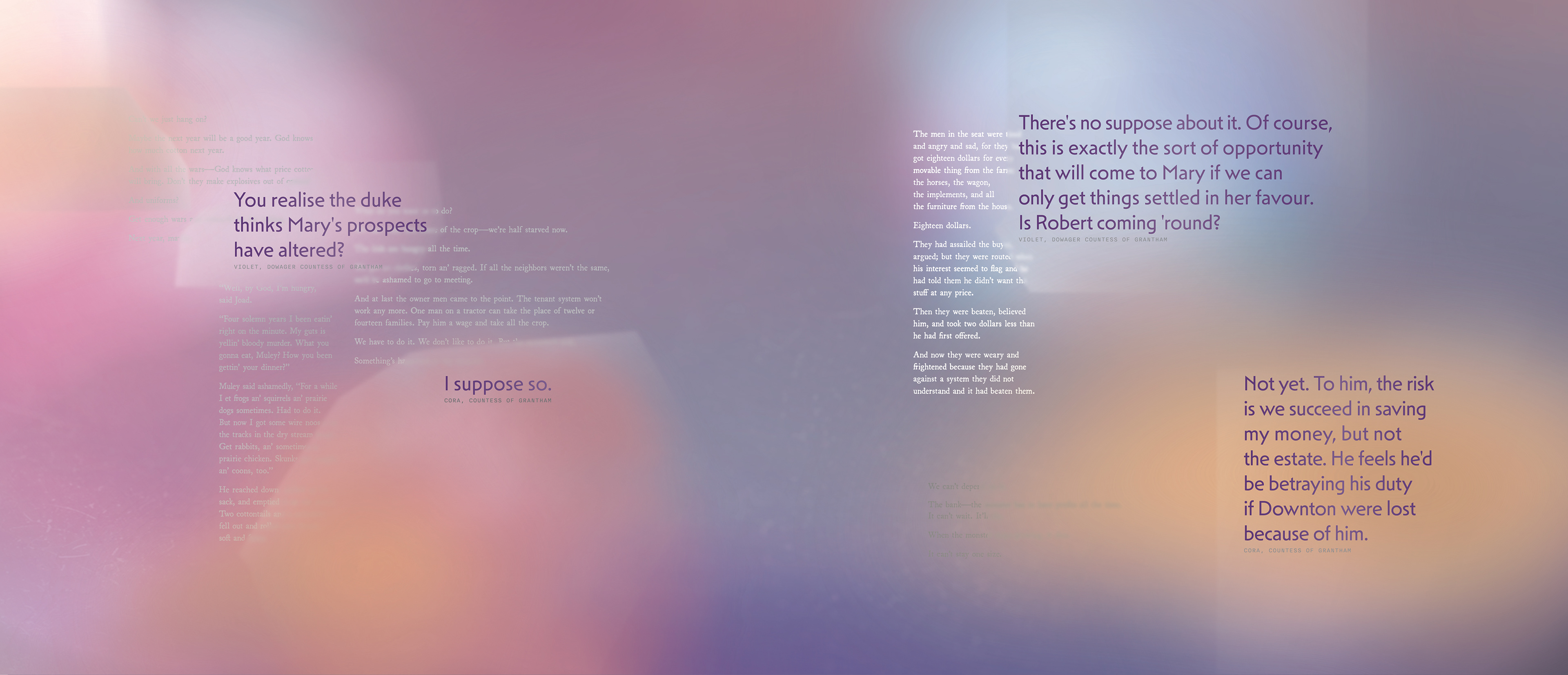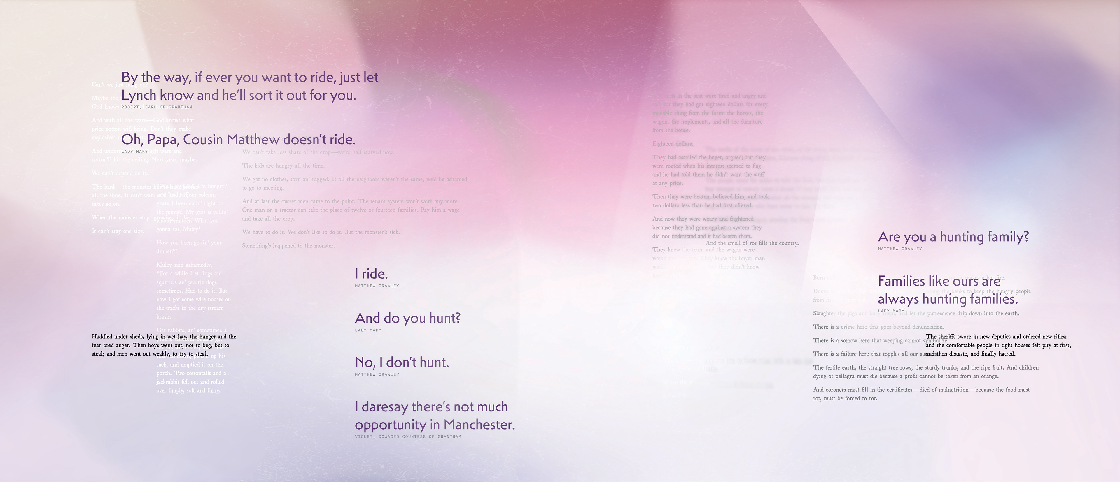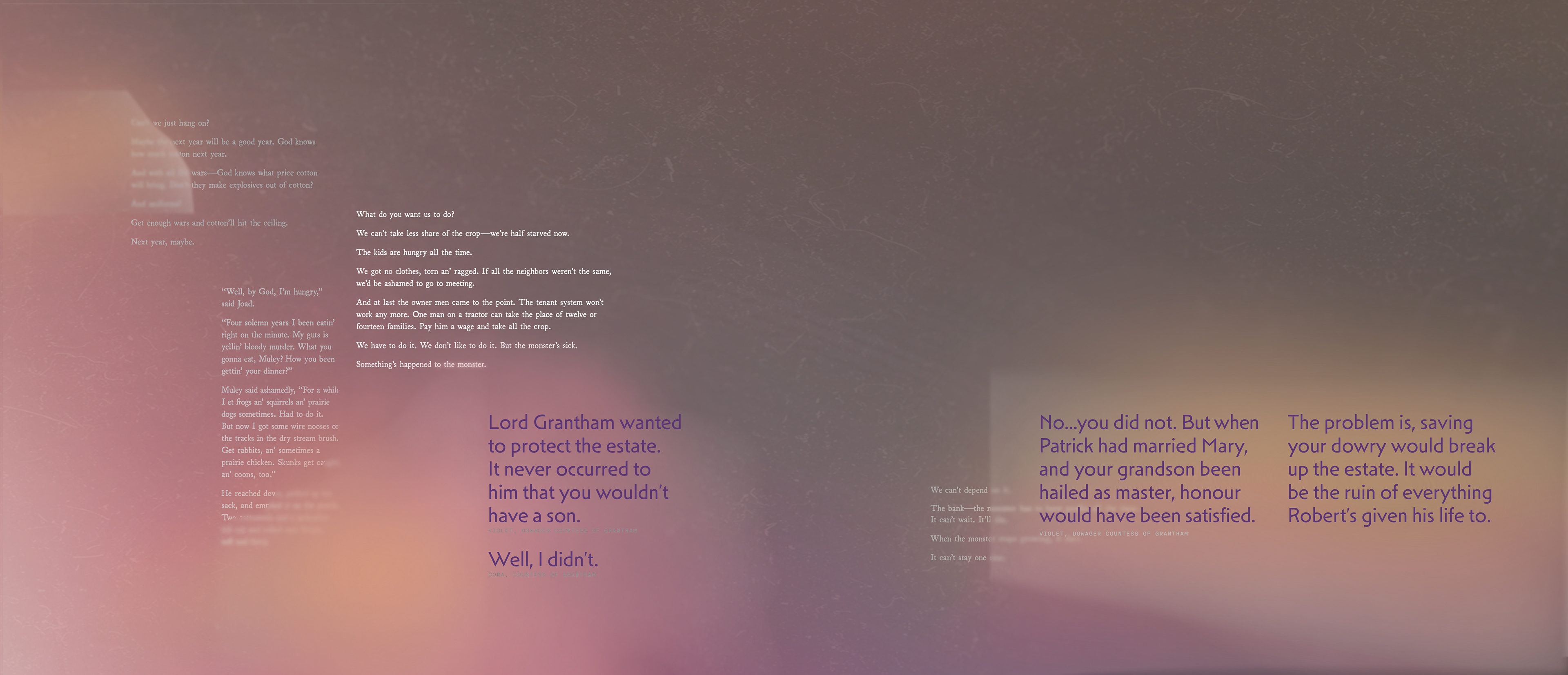 A book design communicating the obscuration and dilution of class struggle in historical dramas, utilizing excerpts from the television show, "Downton Abbey," and the novel, "The Grapes of Wrath" by John Steinbeck.