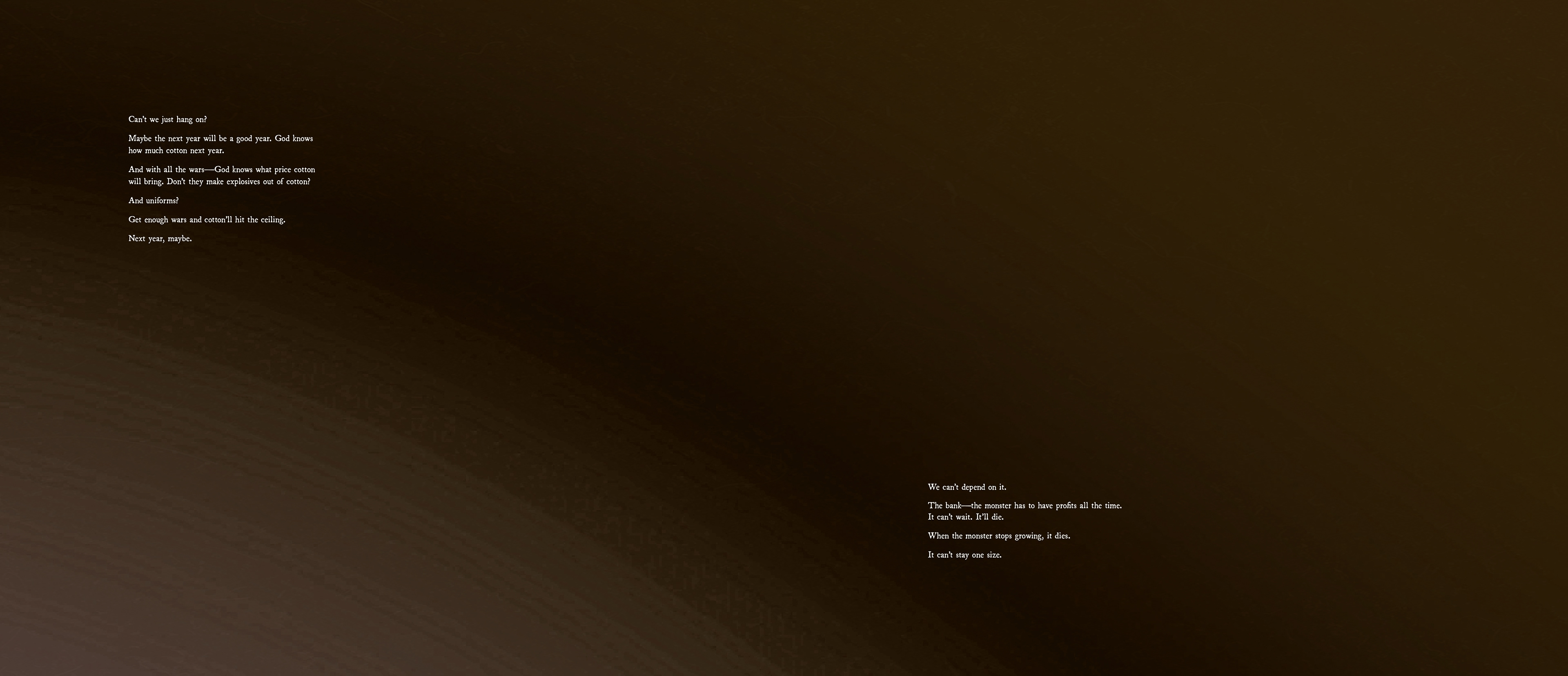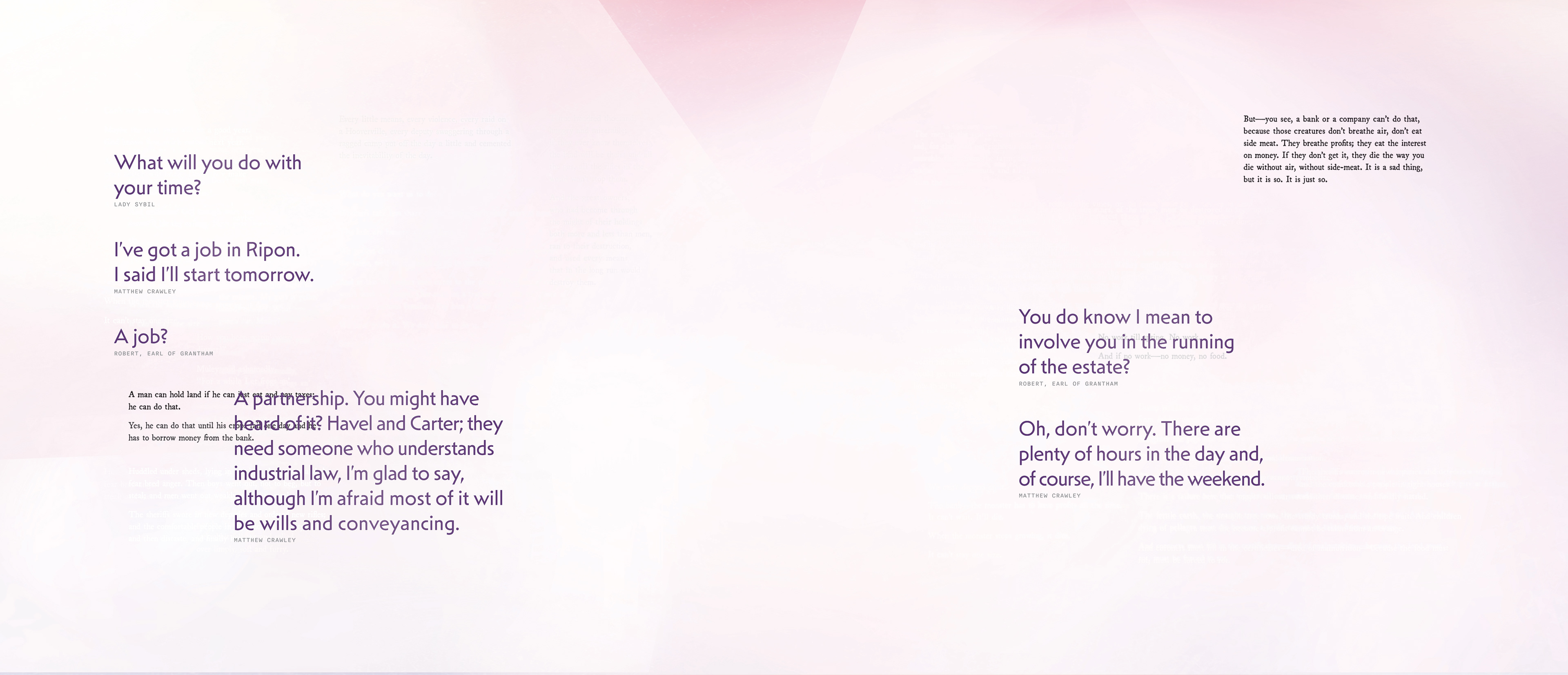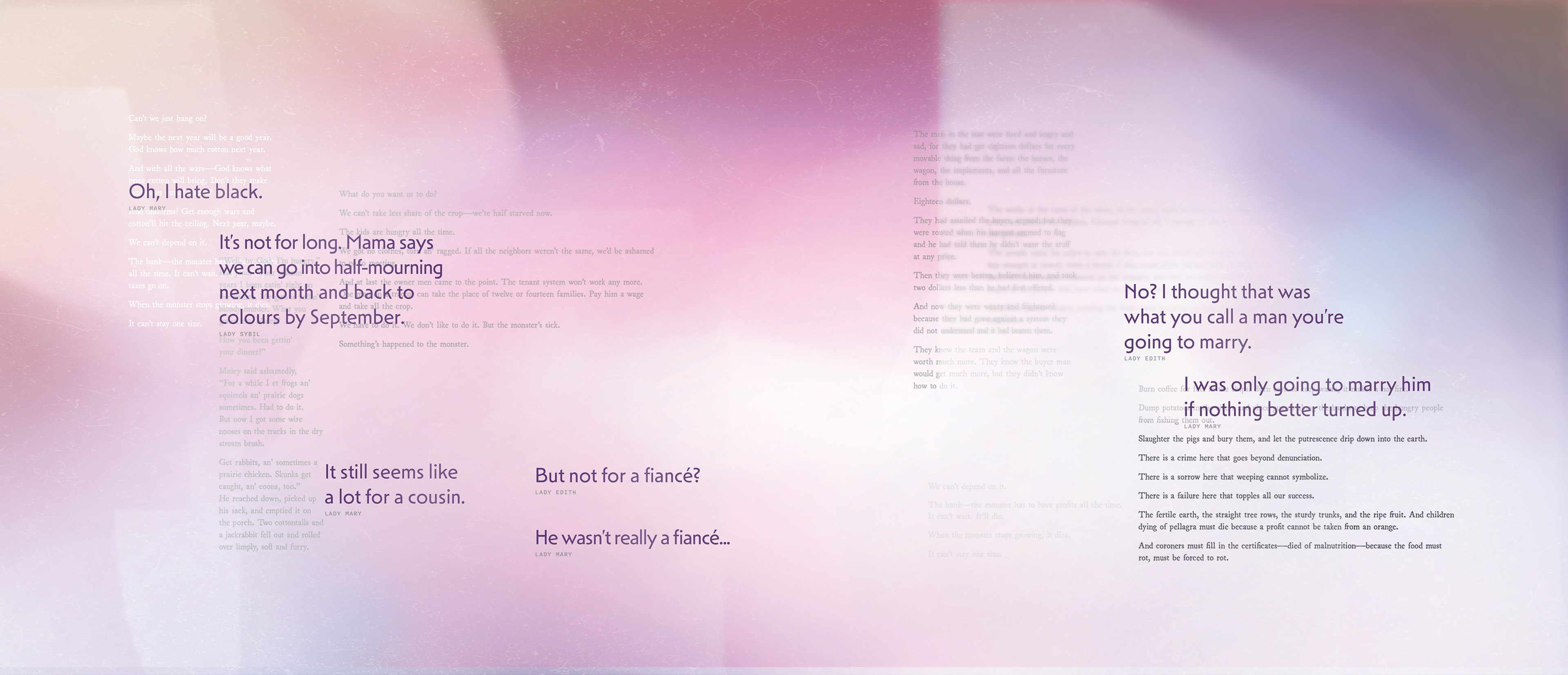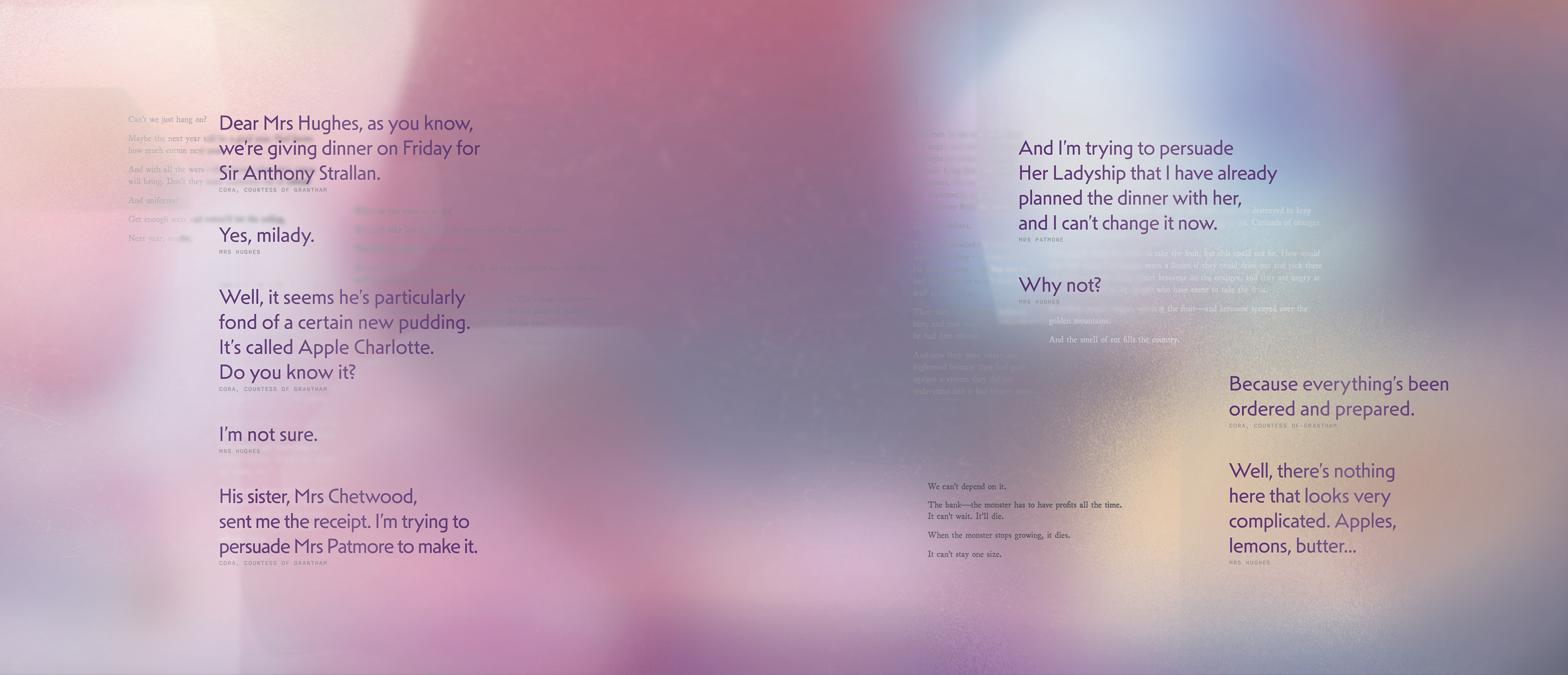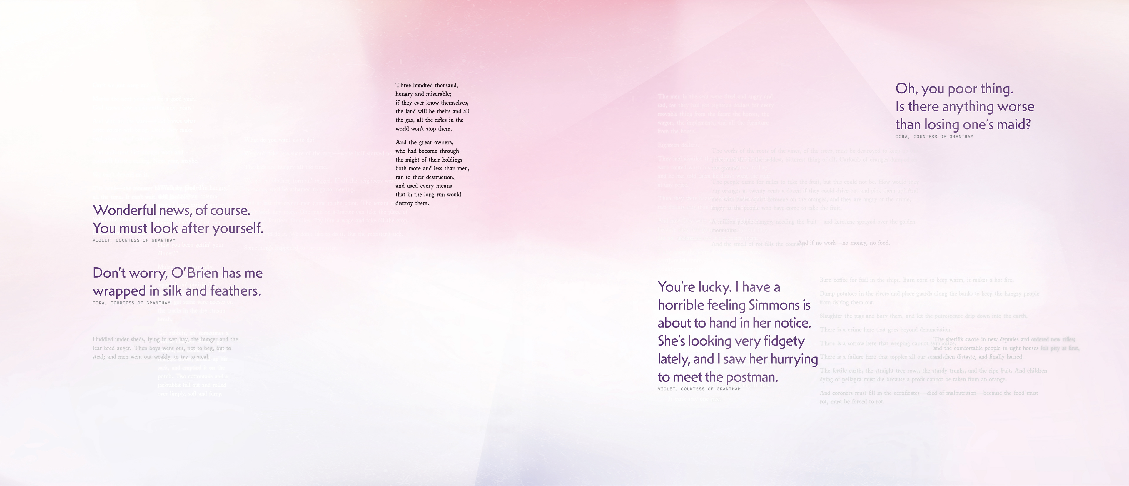 A book design communicating the obscuration and dilution of class struggle in historical dramas, utilizing excerpts from the television show, "Downton Abbey," and the novel, "The Grapes of Wrath" by John Steinbeck.